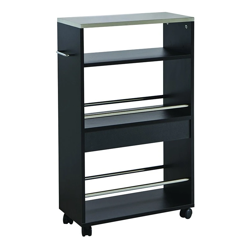 Desserte de cuisine noire sur 4 roues , idéale pour servir ou desservir la table. Ces 4 roues avec freins permettent de transporter facilement de nombreux éléments en toute sécurité. Équipée de 4 plateaux et d’un porte torchon, cette desserte offre de nouveaux espaces de rangement. Son dessus en inox lui confère un style résolument moderne et peut devenir la place idéale de la cafetière. Multi-usage, cette desserte peut également être utilisée dans une salle de bain. Desserte en panneaux de particules, épaisseur : 15 mm. Revêtement mélamine. Finition BRILLANT. Dessus inox. Porte torchon : Longueur de la poignée : 11 cm. Livrée en kit, à monter soi-même.