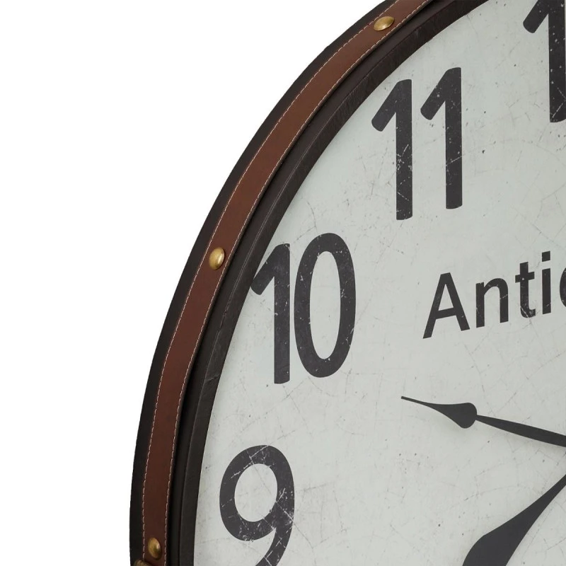 Grande horloge de 92 cm de diamètre cerclĂ©e d’une ceinture en simili cuir.