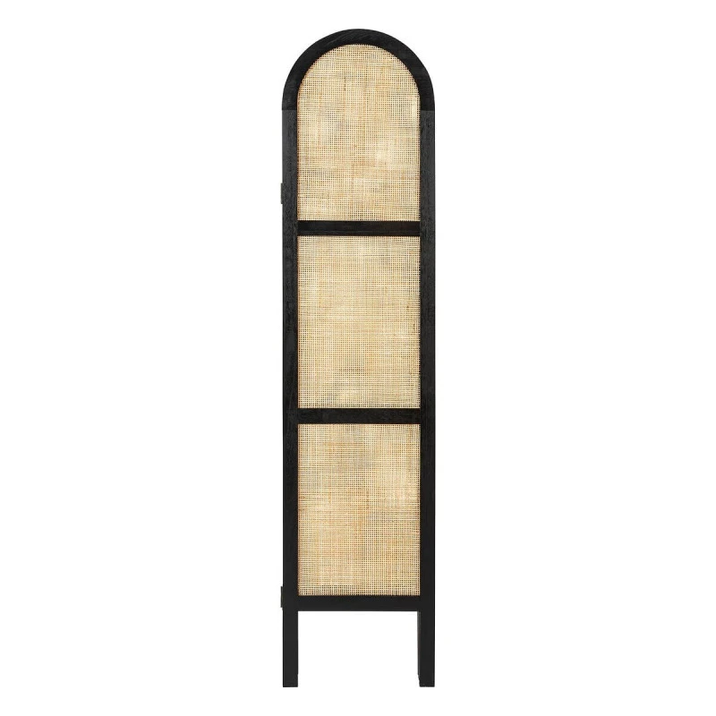 Les panneaux en bois noir sont finement travaillés et le cannage en rotin ajoute une texture délicate qui laisse passer la lumière tout en préservant l’intimité.