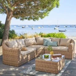 Craquez pour le confort du salon de jardin Moorea d’angle 5 places coloris savana de marque Hespéride.