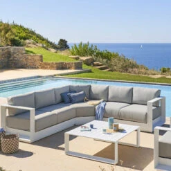 Adoptez un style élégant et un confort ultime pour votre extérieur avec le salon d’angle 5 places Allure coloris gris minéral / blanc de la marque Hespéride.