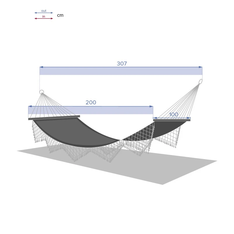 Longueur totale du produit avec les cordes 307 cm.