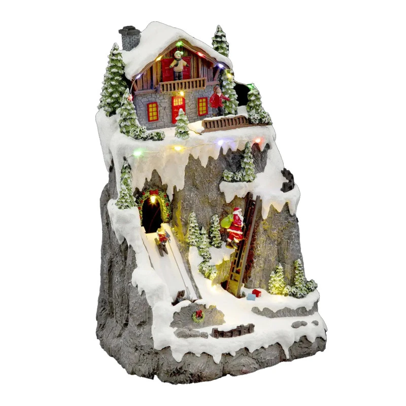 Contemplez tous les détails de cette scène hivernale : une petite piste de ski animée, un chalet surplombant la montagne et le Père-Noël qui grimpe discrètement chargé de cadeaux…